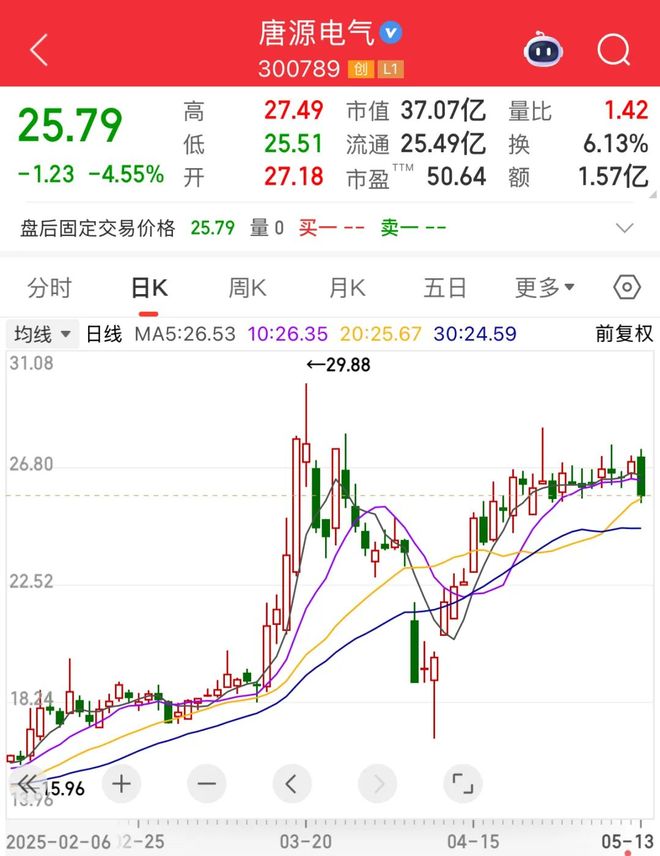 二级市场方面,截至13日收盘, 唐源电气下跌4.55%,报25.79元/股,总市值37.07亿元。