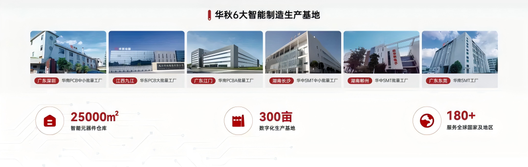 SMT制造:华秋SMT是高可靠一站式PCBA制造商,布局4大自营SMT工厂(东莞 / 长沙 / 郴州 / 江门),提供BOM配单、钢网制作、SMT贴片及DIP插件、后焊、组装等全流程方案设计;支持 “1 片起贴,12小时出签样”,首单50套内还可享免费贴片服务,SMT贴片低至 0.006元 / 焊点,性价比优于行业20%-30%,精准匹配研发型企业小批量、多品种的紧急生产需求。